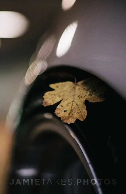 The photograph above was not just one shot, but a collection of about 9 or 10 using my 85mm f1.8, the end result is a much wider shot whilst retaining the shallow depth of field around the car. There's a great balance of out of focus elements in the foreground and background and the car itself has stayed nice and sharp. The shot to the right was taken with the 50mm f1.4 and gives an idea of how low the car is even with the main focus on the leaves.
